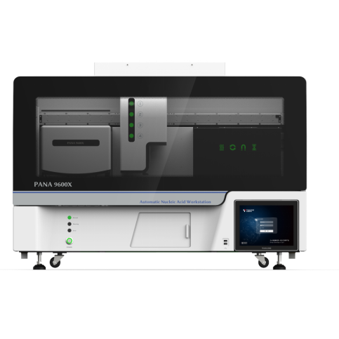 PANA 9600X 全自动核酸工作站是天隆科技自主研发的一款全自动样本处理与核酸纯化设备。该设备可以满足原始样本管带盖直接上机,一键操作,即可一次性自动完成 96份样本的信息扫描、样本管开关盖、样本加载、核酸提取、PCR 体系构建的需求。该产品采用天隆科技创新研发的旋转式磁珠法核酸提取技术(专利号 ZL201710435931.8),匹配性能卓越的专用核酸提取试剂,能够在更短的时间内,从全血、血清、血浆、拭子洗液、尿液等样本中提取所需核酸,保证下游的具体应用。